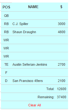 I usually like to start with a value defense to give me the most flexibility. This week there are a couple good options. San Francisco (2100) is on the road at Cleveland. The Over/Under on this game is only 41. Johnny Manziel will be under center this week, and the 49ers have held Jay Cutler (202 Passing yards, 0 TDS, 1 Int) and Carson Palmer (271 passing yards, 0 Passing TDs, 1 Rushing TD) in check the last two weeks. They make a good value option defense in my eyes.